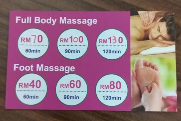 服务价钱:1小时按摩RM70,1.5小时RM100,2小时RM130;脚底按摩:1小时RM40,1.5小时脚底肩膀RM60,2小时脚底肩膀RM80